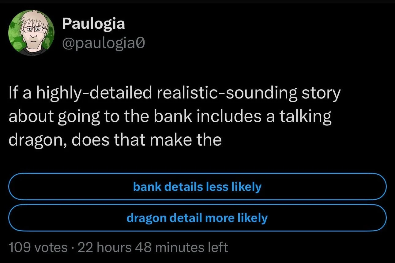 “If a highly-detailed realistic-sounding story about going to the bank includes a talking dragon, does that make the dragon more likely?”